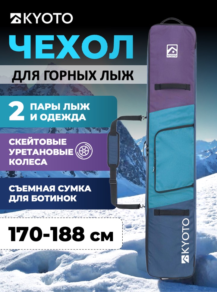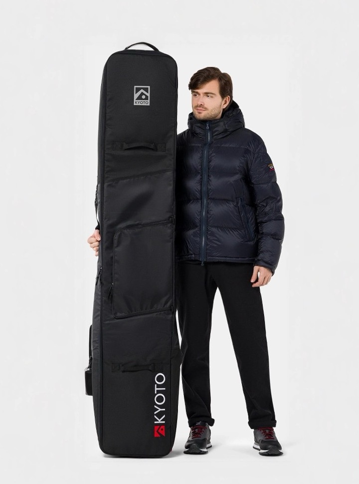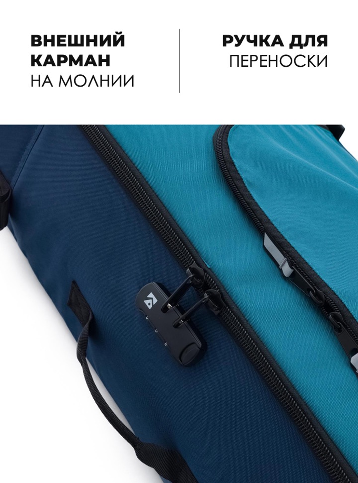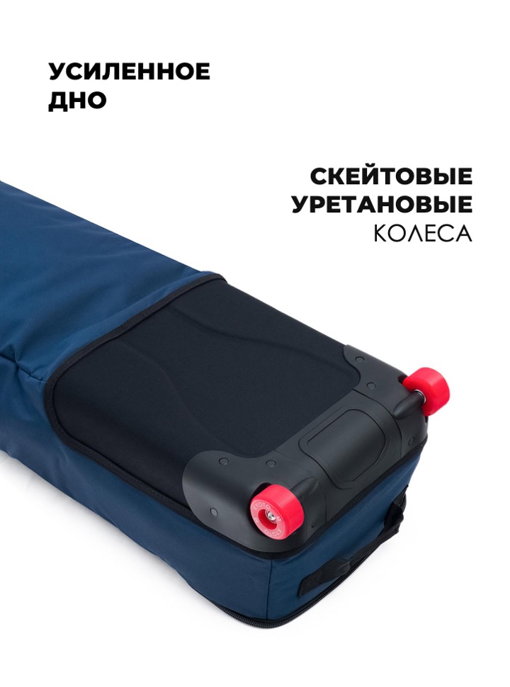 Уплотнённый горнолыжный чехол на прочных колёсах и водостойким покрытием внутри.
