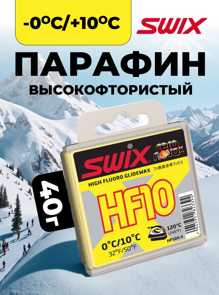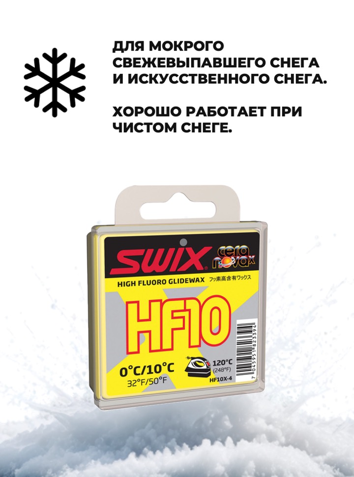 Температурный диапазон от +10°C до 0°С. Рекомендуемая температура утюга 120°С. Новая мазь в линии Cera Nova X имеет более сложный состав, чем старая HF10. Многочисленные тесты показали, что новая мазь с усовершенствованной формулой, более твердая, чем HF10, лучше работает в указанном температурном диапазоне, по сравнению со старой классикой, особенно при использовании самостоятельно. Скорректированная твердость также делает новую мазь более износоустойчивой. Может использоваться в качестве гоночной мази, но чаще всего – как базовый слой под порошок FC10X.