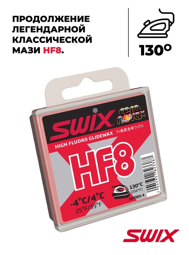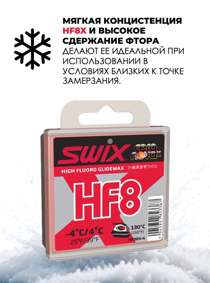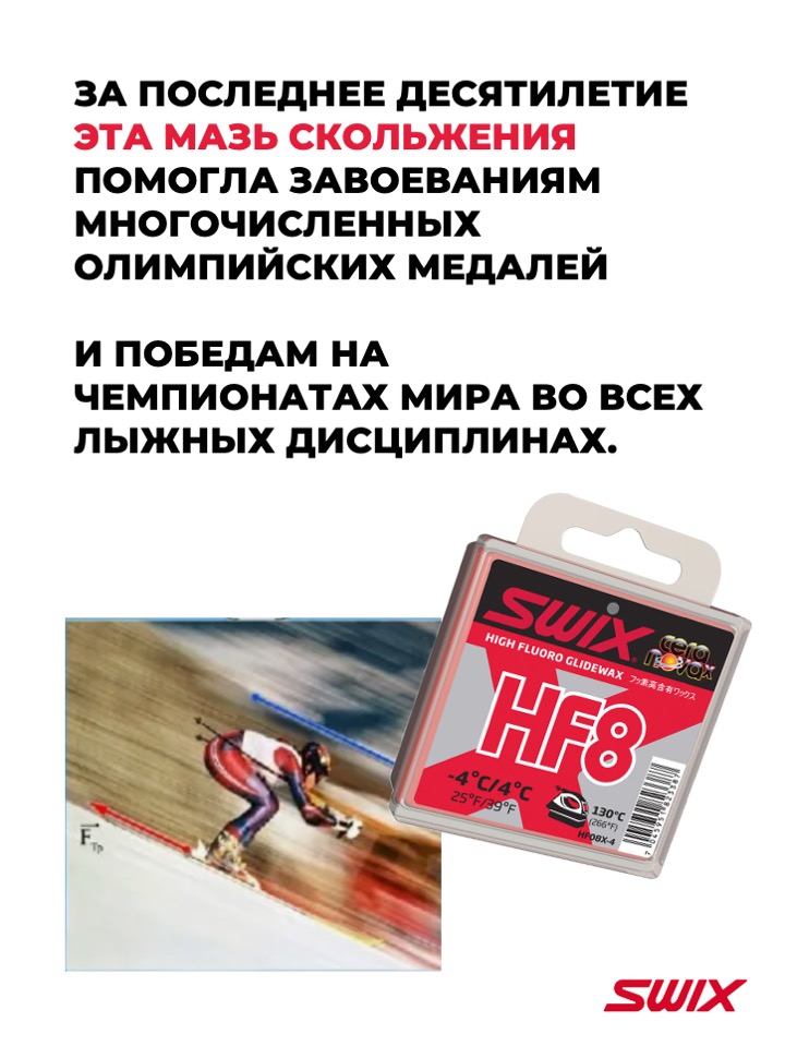 Температурный диапазон от +4°C до -4°С. Рекомендуемая температура утюга 130°С. Продолжение легендарной классической мази HF8. За последнее десятилетие эта мазь скольжения способствовала завоеваниям многочисленных олимпийских медалей и победам на Чемпионатах Мира во всех лыжных дисциплинах. Мягкая консистенция HF8X и высокое содержание фтора делают ее идеальной при использовании в условиях близких к точке замерзания. Может использоваться в качестве гоночной мази, но чаще всего - как базовый слой под порошок FC08X.