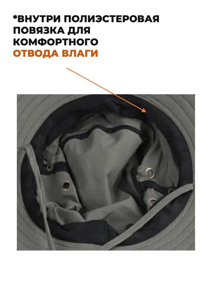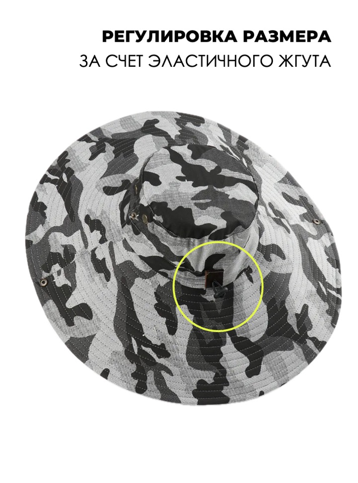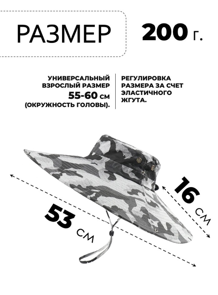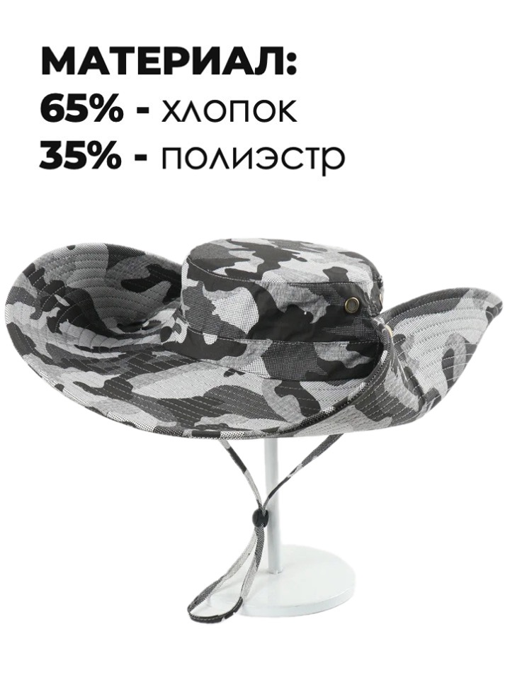 Широкополая туристическая шляпа с возможностью закрепления полей по бокам. Широкие поля (16 см) полностью защищают от солнца во время отдыха на природе, работы на даче или рыбалки.