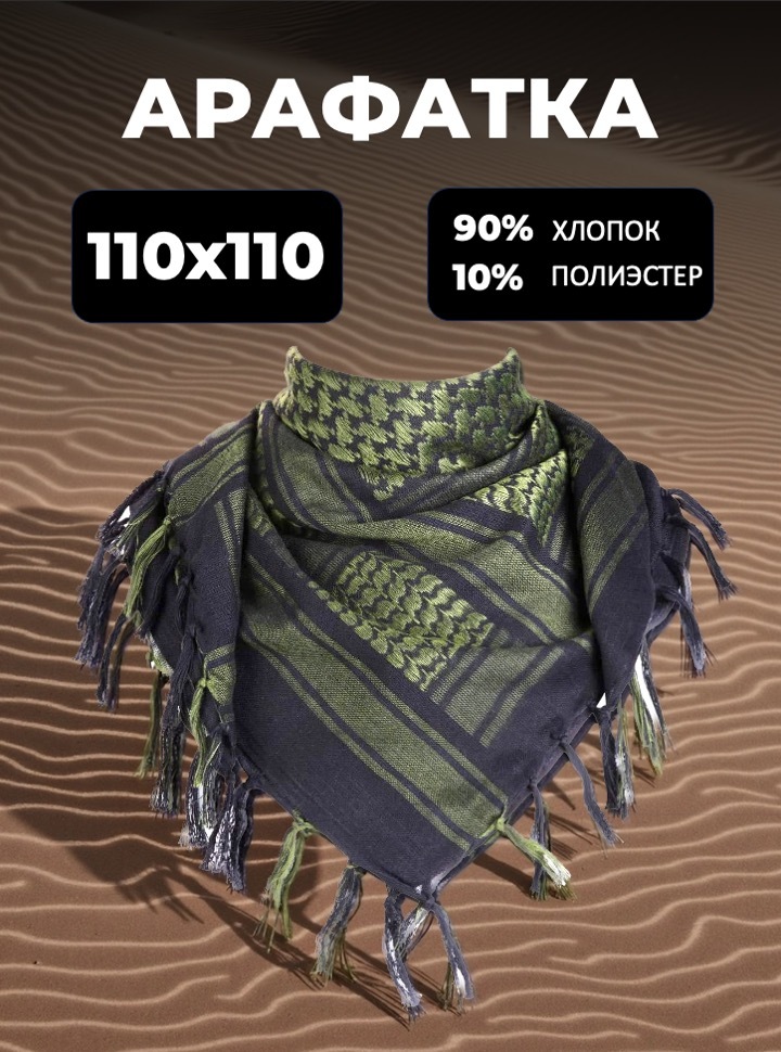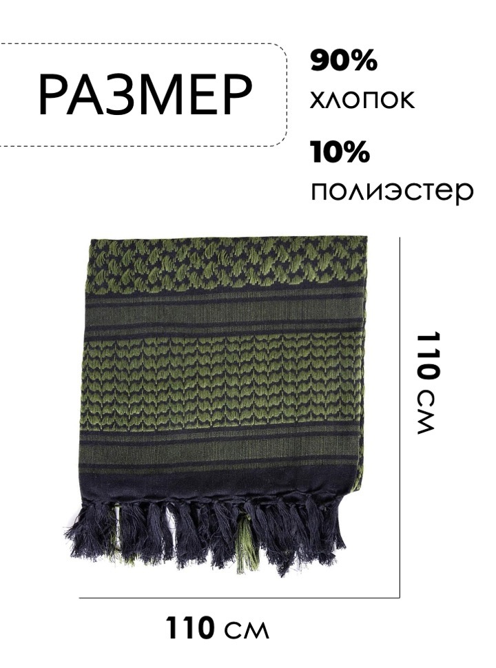 Большой классический шемаг 110х110 см из качественной пряжи (состав: 90% хлопок, 10% полиэстер). Небольшая добавка полиэстера повышает износостойкость, улучшает дышащие свойства и сокращает время высыхания арафатки. Вес платка-куфии 190 гр.