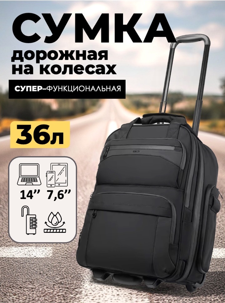 Удобная сумка для поездок из износостойкого материала. Ткань практически не подвержена мелким механическим повреждениям и истиранию. Кроме того, на его внешнюю поверхность нанесено водоотталкивающее покрытиеОсобенности сумки:Мягкие бесшумные колесаВыдвижная ручка (прячется в карман)Механический стопер на дне сумкиДва кодовых замка (для закрытия молнии и для крепления сумки к устойчивой поверхности)Открытие на 180 градусовКарман для ноутбука 14 дюймов и планшета 7,9 дюймовМного карманов (передний карман для влажных или грязных вещей, передний карман быстрого доступа для канцелярии, два маленьких передних кармана на молнии, два боковых кармана для бутылки или зонта). Удобная лента крепления на чемодан.Вместительное основное отделение.