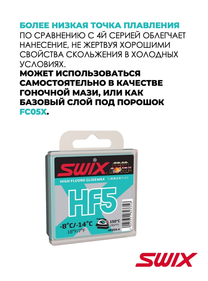 Серия «5» является новой в линии Cera Nova X, и заполняет разрыв по твердости между 4-й и 6-й категориями мазей. Эта мазь была создана по просьбе представителей горнолыжного спорта, успешно использовалась в Кубке мира в течение последних двух сезонов. В лыжном спорте HF05X также приобретает популярность при использовании в холодных кондициях.