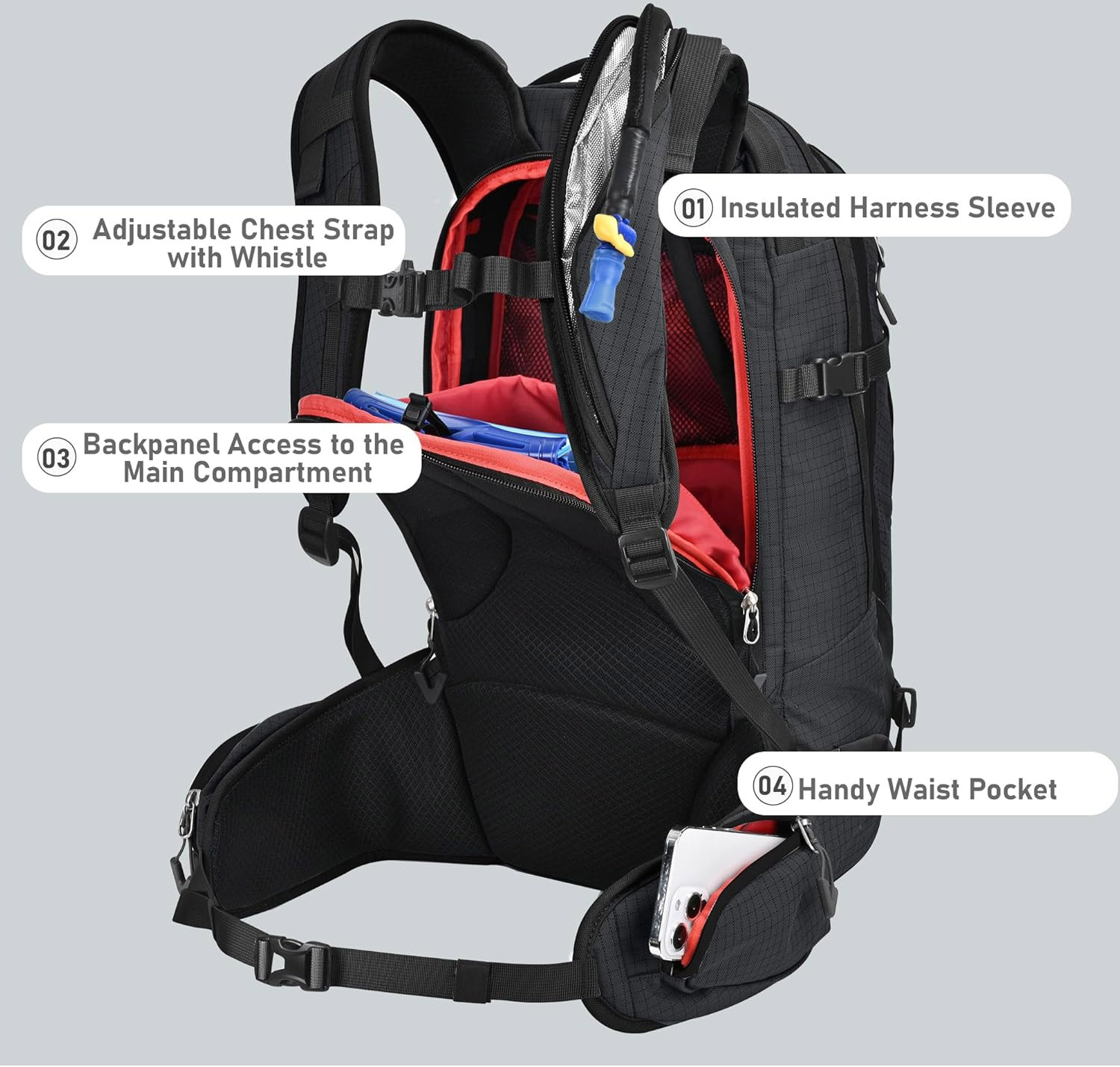 • Трубка полностью скрыта от непогоды внутри лямки. Прячется в термоизолированный карман на молнии.