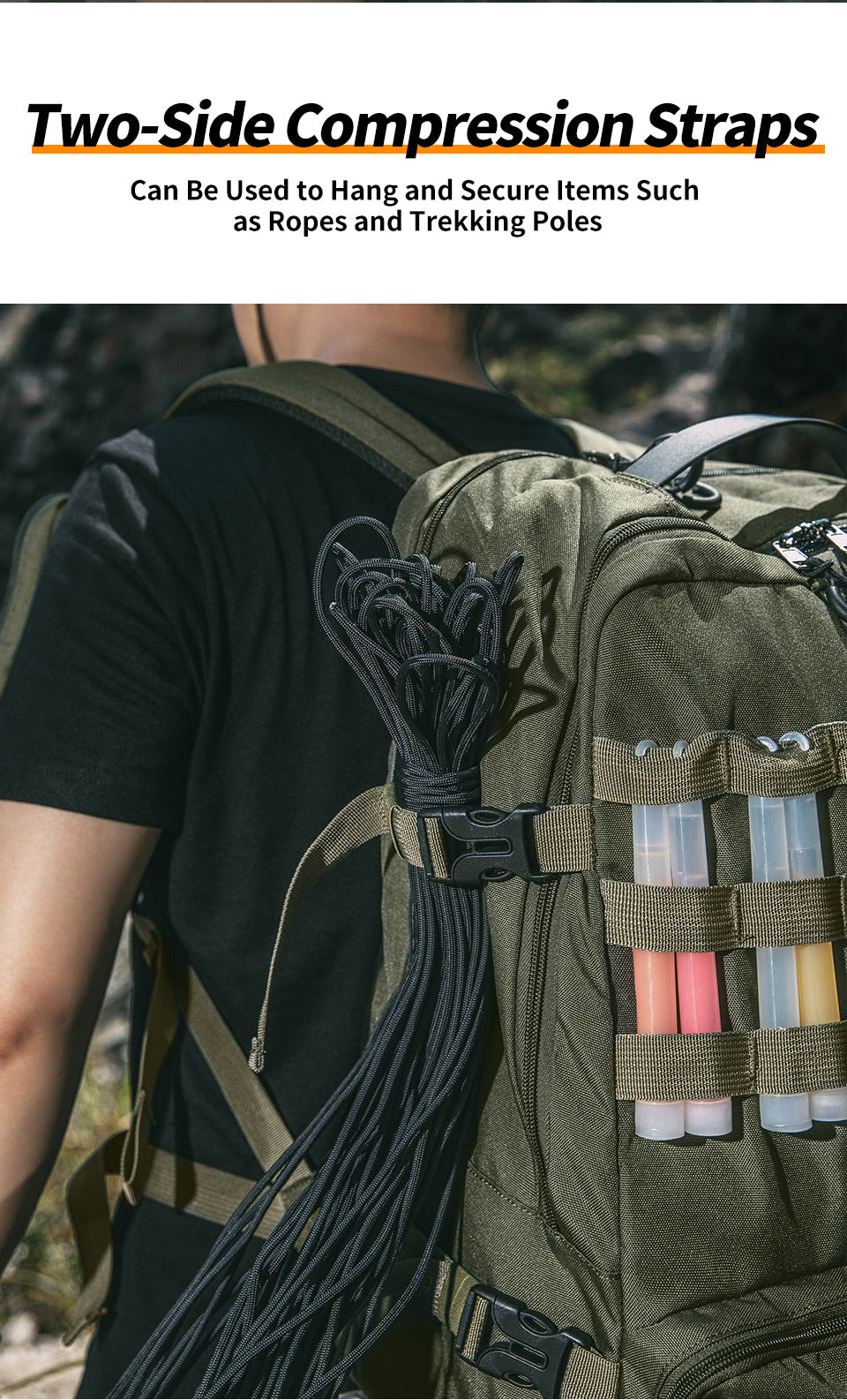 • Сбоку компрессионные стропы для крепления треккинговых палок, верёвок и других аксессуаров.
