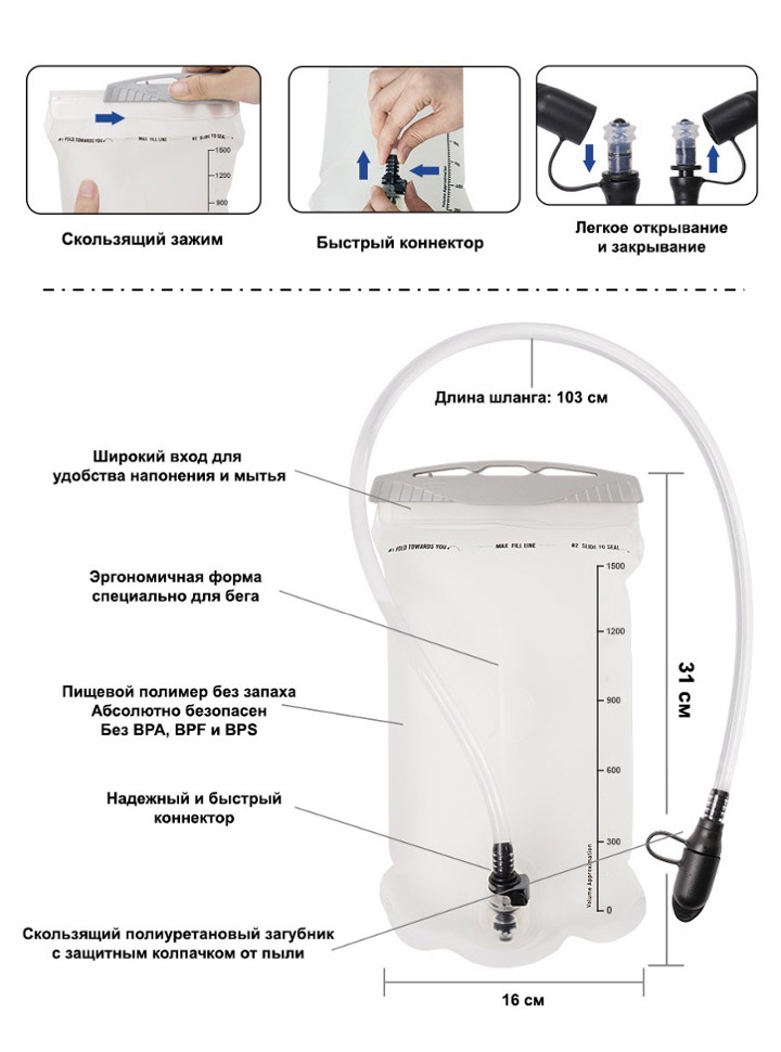 • питьевая система с защитным колпачком от пыли в комплекте. Объем 1,5 л.