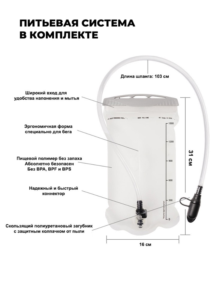 • питьевая система с защитным колпачком от пыли в комплекте. Объем 1,5 л.
