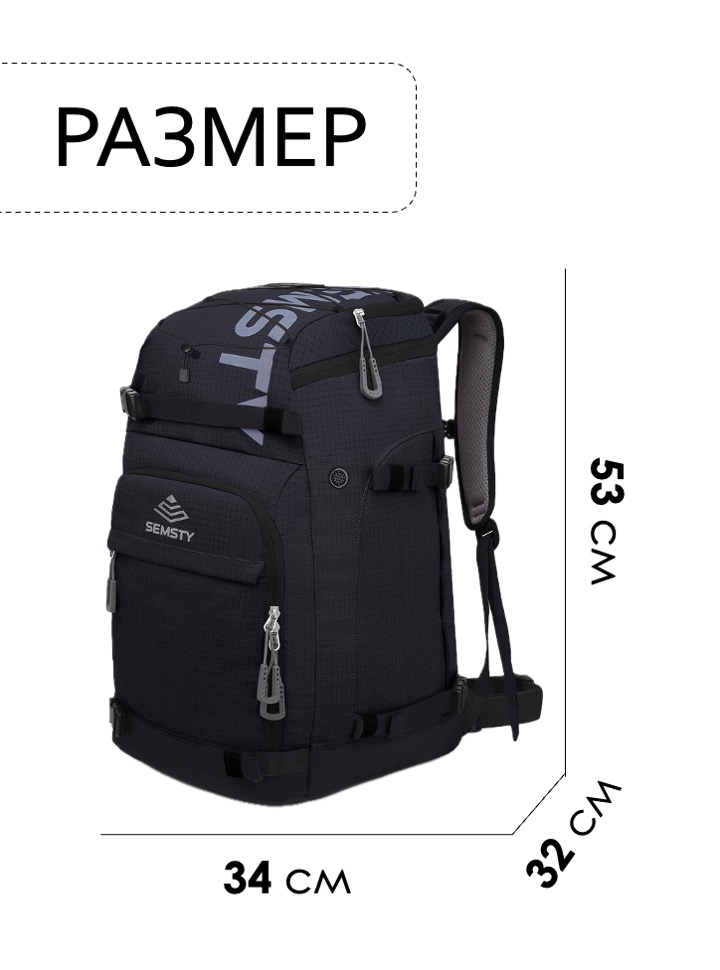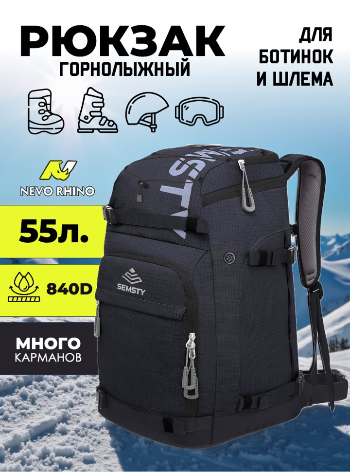 Функциональный рюкзак для горнолыжных ботинок. В нем достаточно места, чтобы уложить все горнолыжные аксессуары. В ней поместится шлем, очки, перчатки и другие аксессуары — и всё будет аккуратно разложено.