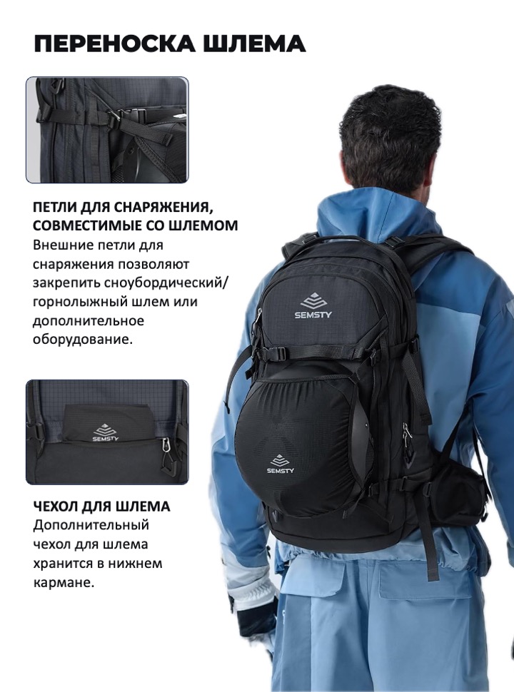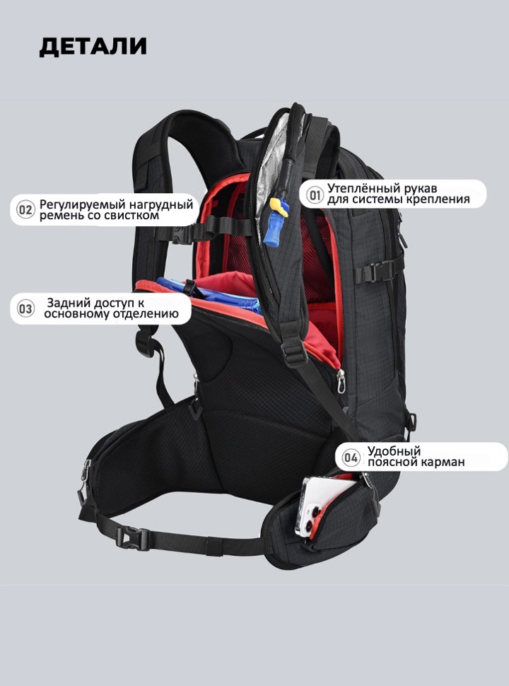 Универсальный рюкзак для горнолыжников и сноубордистов сочетает удобство и надёжность. В нём есть карман для очков на флисовой подкладке, отсек для лопаты и место под гидратор. Трубка для питья скрыта в лямке, защищая от непогоды. Предусмотрены крепления для лыж и сноуборда, съёмный подвес для шлема и поясной ремень. Прочный водонепроницаемый материал гарантирует долговечность.