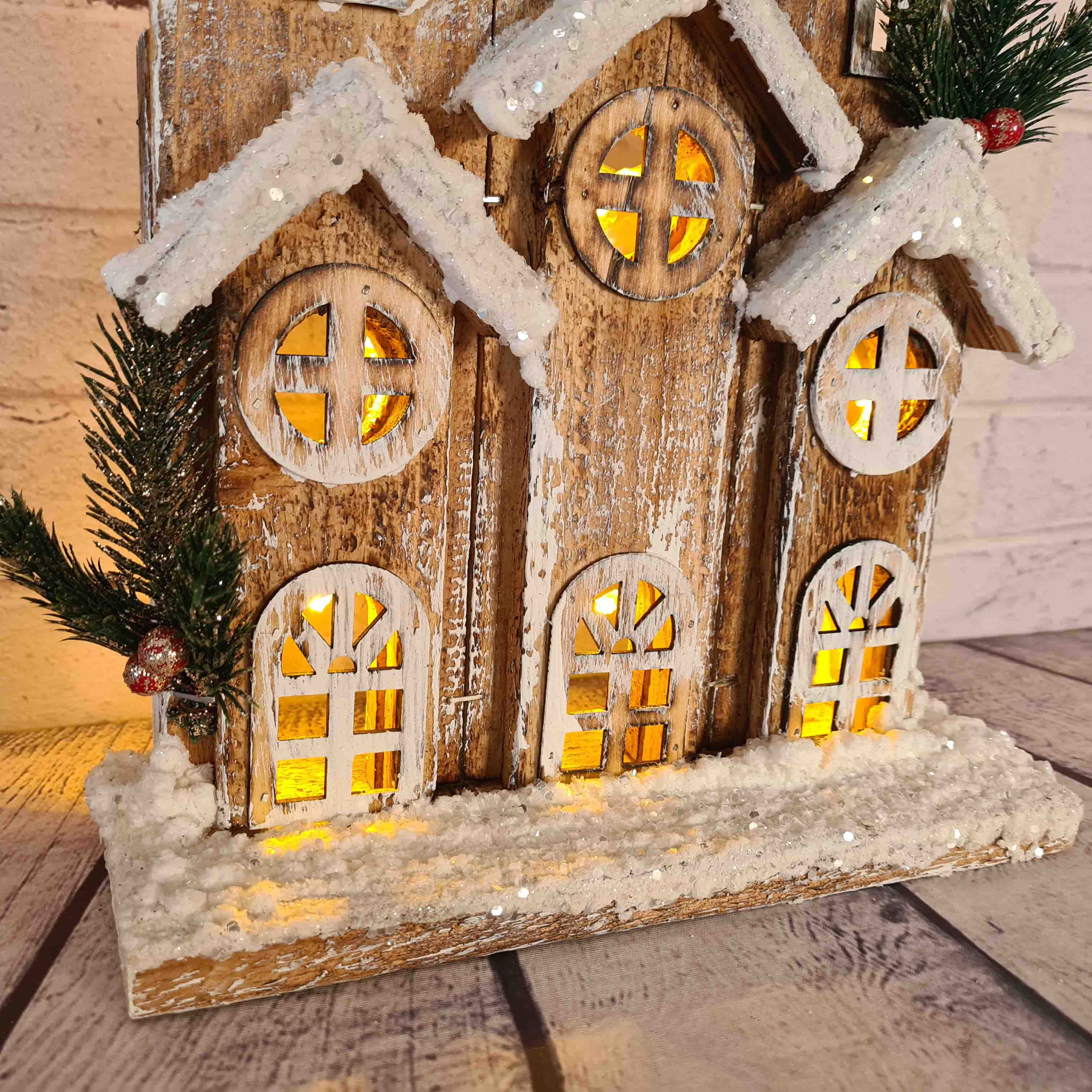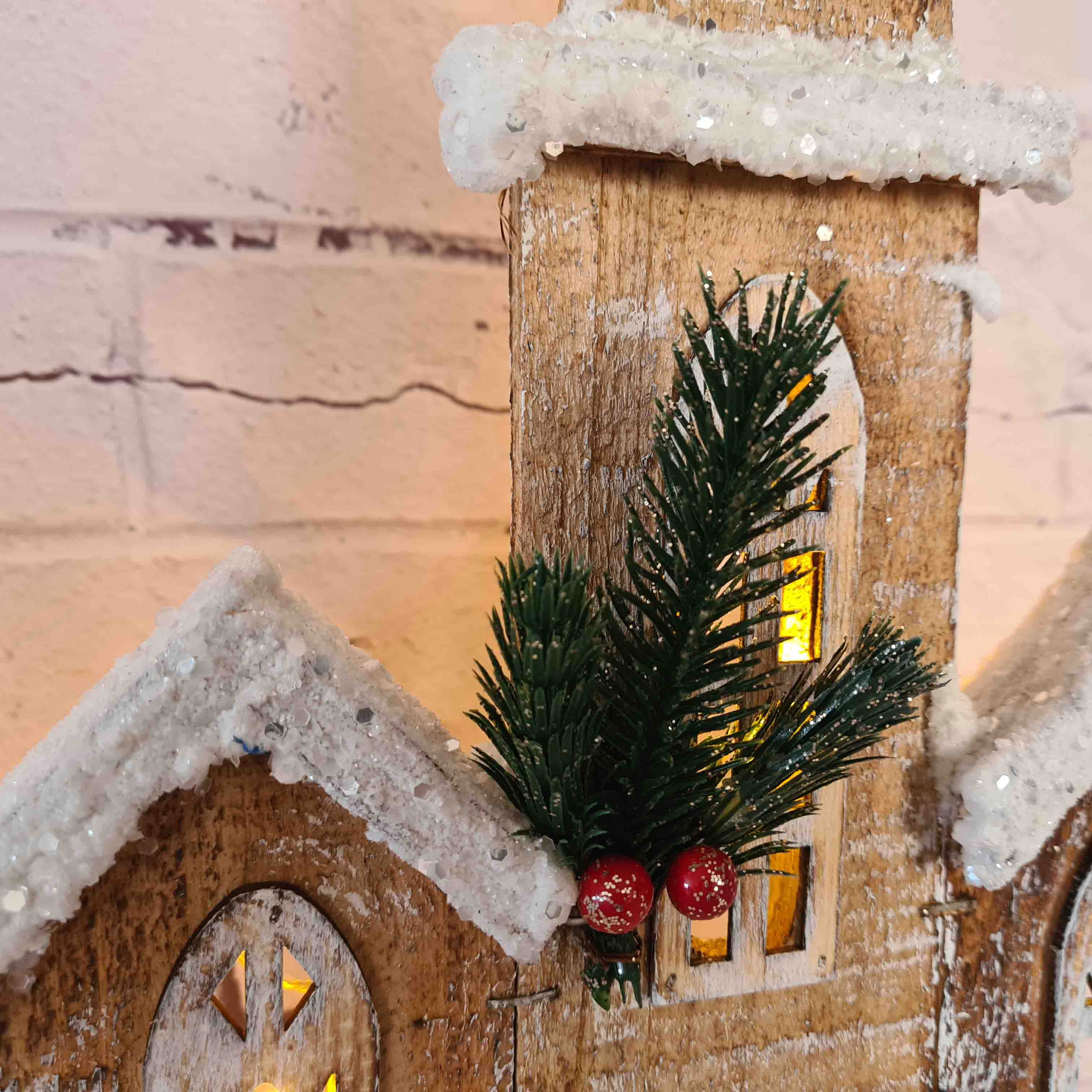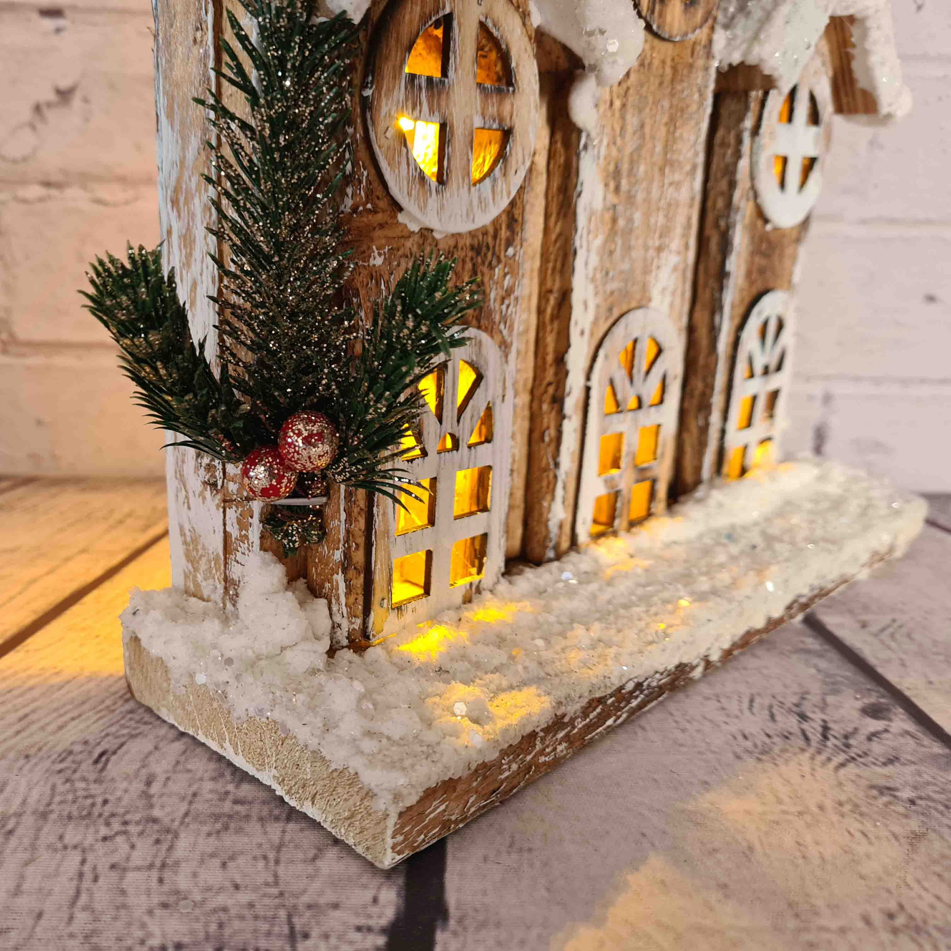 Деревянное рождественское украшение в виде домика засыпанного снегом станет очаровательным дополнением к вашему праздничному декору. По желанию можно включить подсветку окон. Используйте этот милый сувенир для оформления рождественского вечера или преподнесите в качестве подарка близким. Украшение создаст милую и праздничную атмосферу! Отличается изысканной конструкцией и тонкой работой — выглядит уникально.