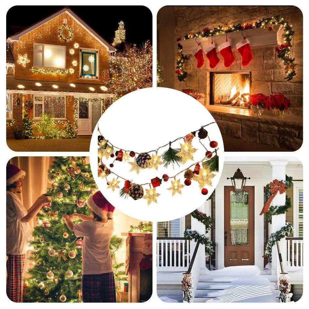 • На гирлянде: Шишки натуральные, снежинки, пучки ёлок, имитация ягод рябины, красные бубенчики.