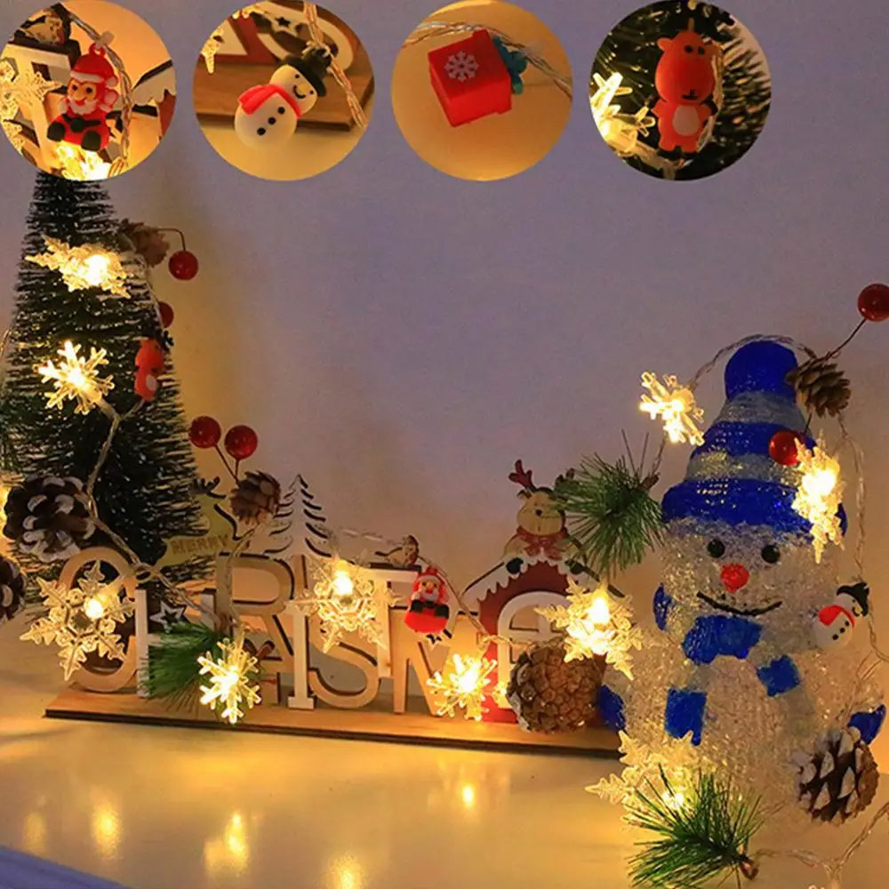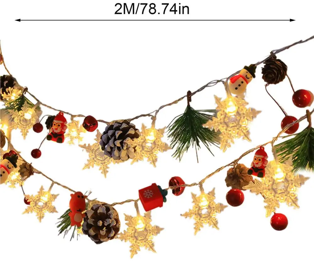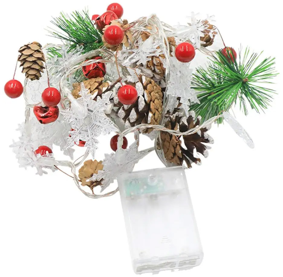 • На гирлянде: Шишки натуральные, снежинки, пучки ёлок, имитация ягод рябины, мини-фигурки (снеговик, олень, подарок, елочка, дед-мороз).