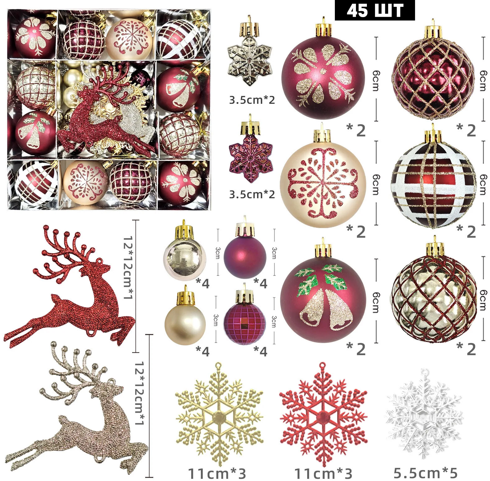 • 🎄 Набор ёлочных украшений, 45 шт.: шары (6 и 3 см), звёзды, снежинки, северные олени. Идеально для украшения ёлки в едином ретро стиле.