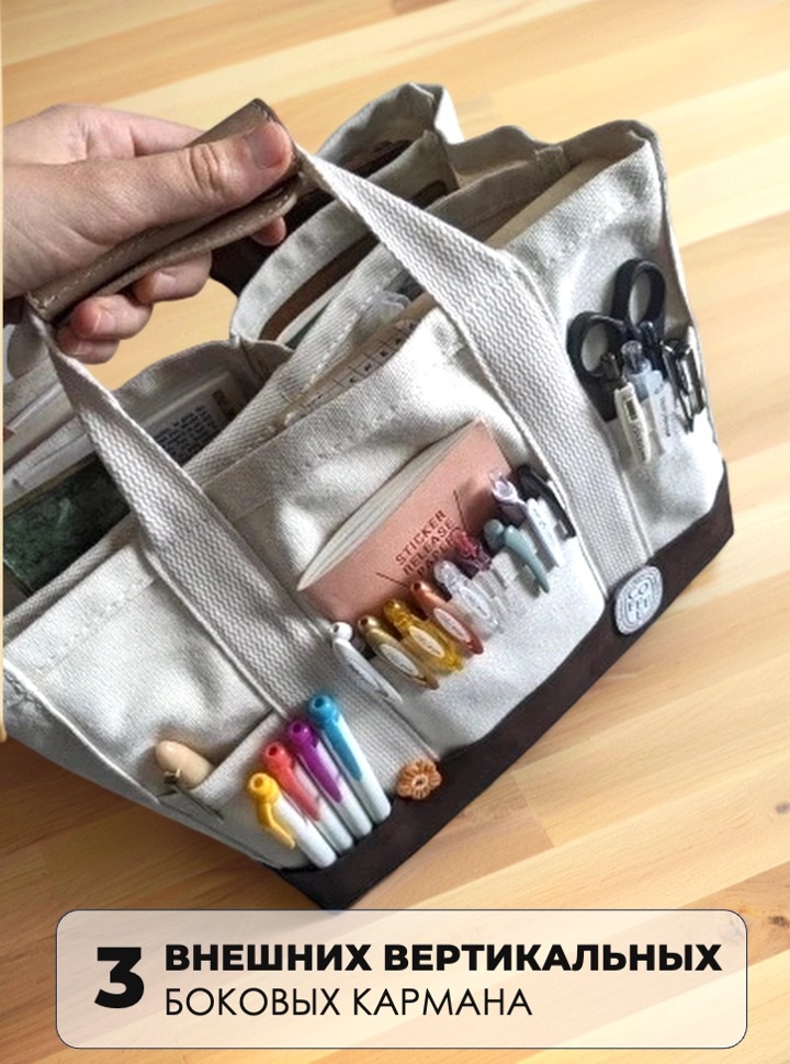 Сумка органайзер выполнена из стильного материала, напоминающего холст и имеет множество удобных отделений и карманов для организации ваших вещей. Удобна для пляжа - положите туда кремы, бальзамы, бутылку с водой и любимую книгу. Прогулок в парке или рисования - поместите туда блокнот для эскизов, карандаши, фломастеры и термостакан. Или используйте сумку для прогулок с маленьким ребенком. Можно положить банки с сухим молоком, детские салфетки, бутылочки для кормления, термос.