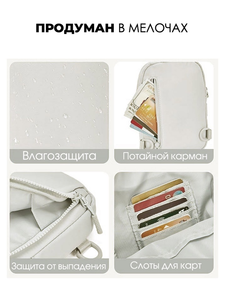 • Плоский потайной карман на молнии на тыльной стороне.