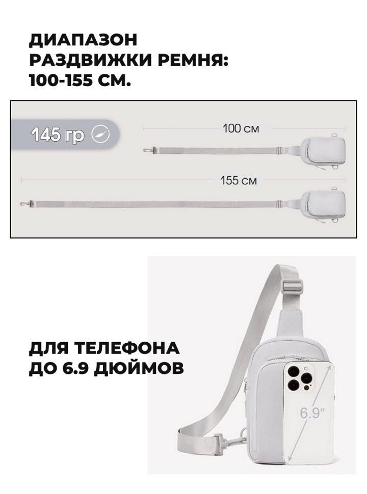 • Диапазон раздвижки ремня: 100-155 см.