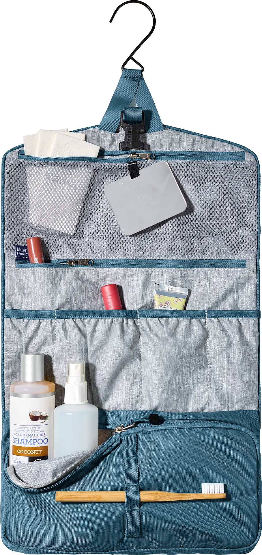Удобная косметичка для ваших туалетных принадлежностей. Благодаря выдвижному крючку вы можете повесить косметичку Wash Bag II в ванной комнате или на разных местах (например, на ветке) в дороге. Большое отделение на молнии и два плоских кармана на молнии (один из них сетчатый) обеспечивают удобную организацию содержимого. Также имеется пять потайных карманов для мелких предметов. Пряжка надежно фиксирует содержимое. Съемное зеркало и эластичные петли для зубной щетки и других туалетных принадлежностей добавляют удобства этой косметички.
