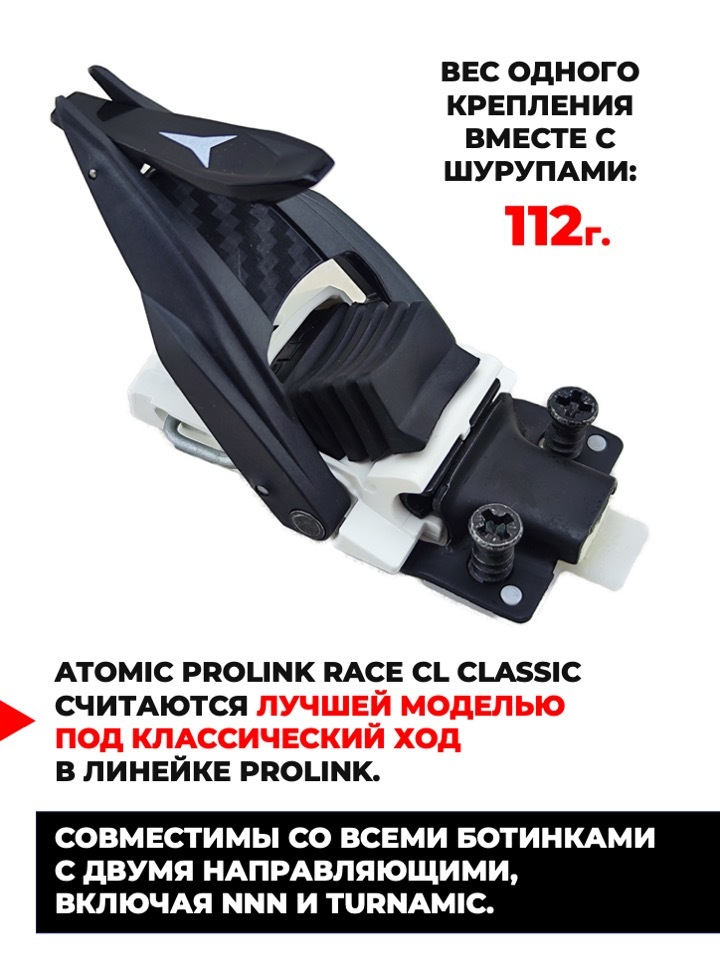 Крепления для классического хода Atomic Prolink Race CL считаются лучшей классической моделью в в линейке Prolink. Совместимы со всеми ботинками с двумя направляющими, включая NNN и Turnamic. Оснащены сверхлёгким карбоновым рычагом Race, который открывается и закрывается вручную.