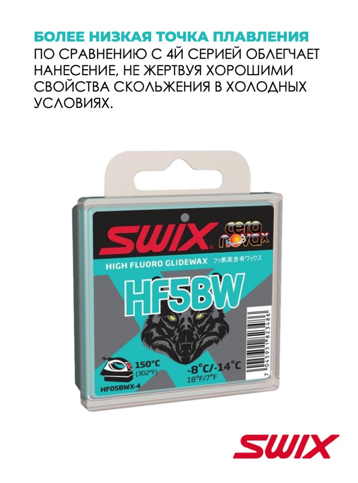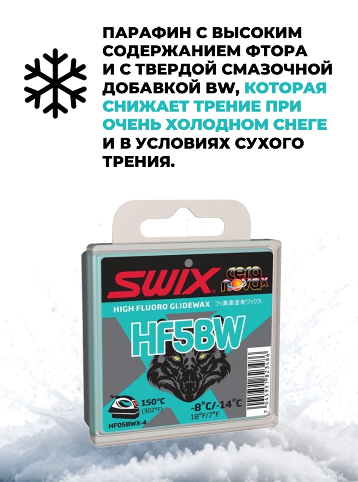 5 серия парафина с высоким содержанием фторуглерода является заполняет разрыв по твердости между 4-й и 6-й категориями. Парафин был создан по просьбе представителей горнолыжного спорта, успешно использовался в Кубке мира в течение последних двух сезонов. В лыжном спорте HF05BWX также был воспринят с большим интересом. Более низкая точка плавления по сравнению с 4й серией облегчает нанесение, не жертвуя при этом хорошими свойства скольжения в холодных условиях.