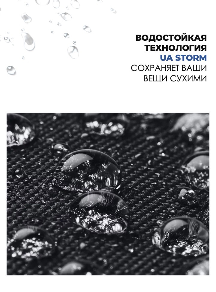 • Водонепроницаемая технология UA Storm сохранит ваши предметы первой необходимости сухими. Используется водоотталкивающее средство, не содержащее фтора.